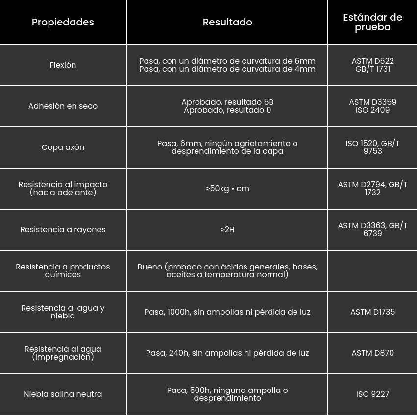 Condiciones de curado (temperatura de la pieza de trabajo): 200°C / 10min. El curado inadecuado puede conducir a la pérdida de color, brillo y propiedades de recubrimiento.